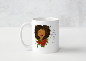 Op de mok is een vrolijk zingende vrouw afgebeeld, die voor God zingt.