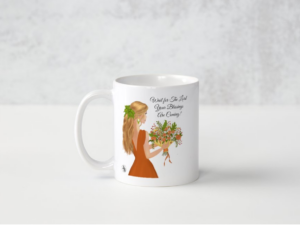 Op de mok is een vrouw afgebeeld die met volle verwachting klaarstaat. God zal haar gebed verhoren op Zijn tijd.